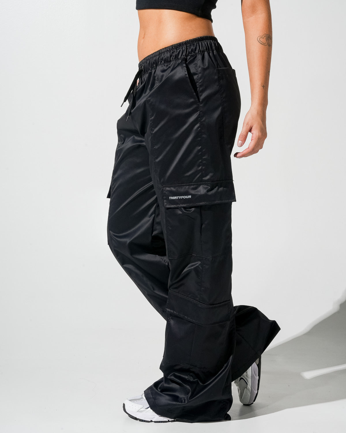 Los pantalones que combinan comodidad extrema con una vibra street impecable. Están confeccionados en tela liviana tipo nylon con acabado brillante, caída amplia y bolsillos cargo funcionales que elevan todo el look.